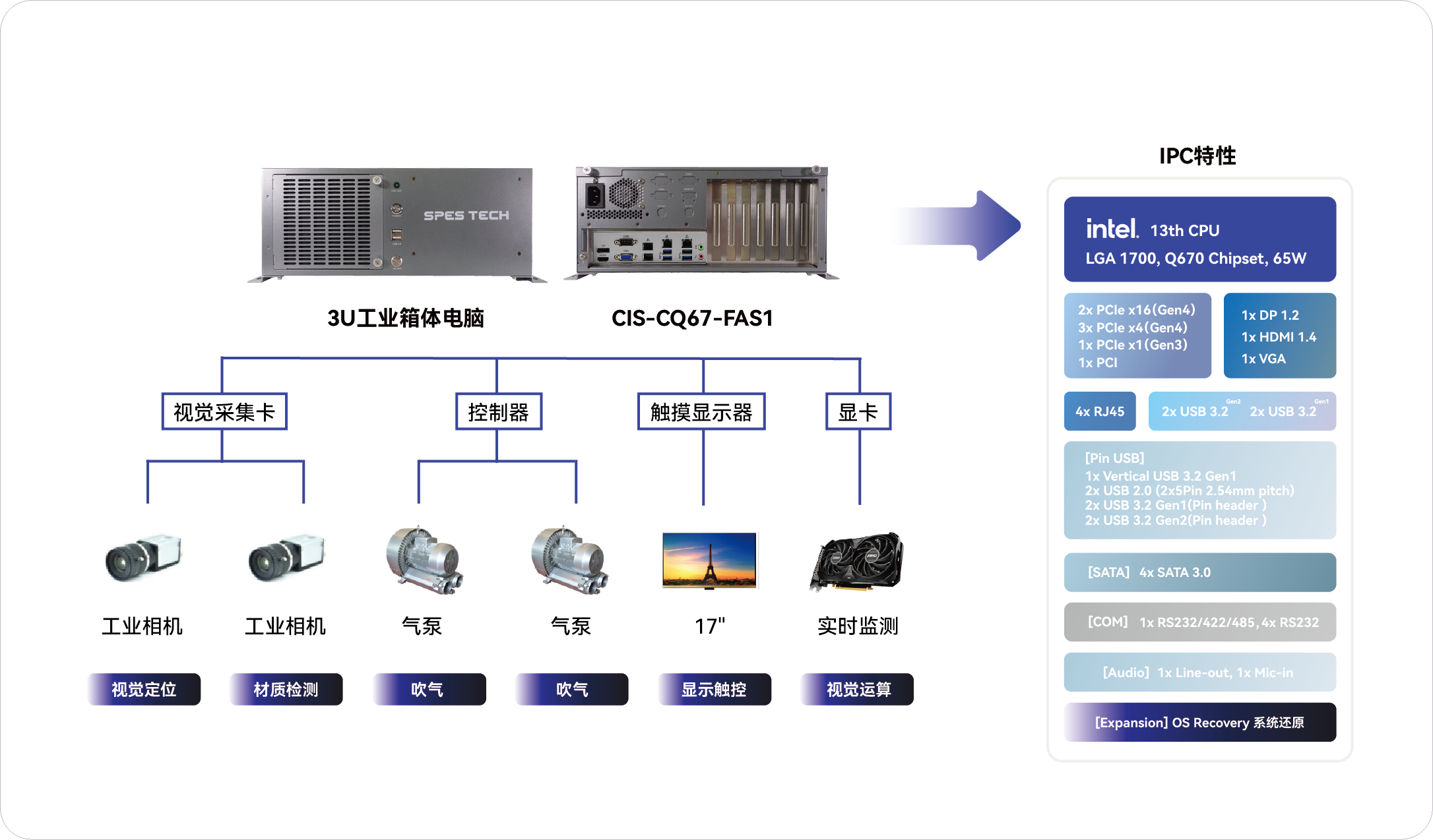 方案核心计算产品具备丰富I/O接口,可为外接多功能模块提供丰富扩展接口资源;用户通过接口实现外接视觉采集卡、工业检测相机、SPES TECH工业等级触摸显示器等智能设备,为PET回收分选提供优质视觉检测环境;